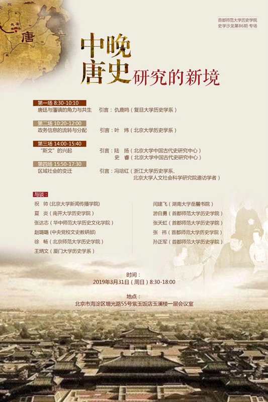 近年来,随着研究视角转换及新资料的利用,中晚唐史研究获得巨大推进,以往较为暧昧甚至被误解的中晚唐历史面貌越来越清晰地呈现于世人面前。基于此,首都师范大学历史学院于2019年3月31日举办了史学沙龙第86期“中晚唐史研究的新境”学术座谈会,邀请来自北京大学、南开大学、北京师范大学、复旦大学、浙江大学、华中师范大学、厦门大学、湖南大学、中央党校、首都师范大学等单位的学者坐而论道,共同研讨中晚唐社会历史的“风景”。