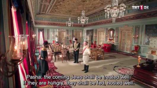 图片6:新奥斯曼主义固然体现了是对伊斯兰教认同的强调,但从奥斯曼帝国的历史实践上看,也可能会包含宗教多元主义的成分。在电视剧Payithat第二季中有一个剧情:一艘俄国舰船贸然闯入奥斯曼境内,奥斯曼军队临阵以待,准备开火。但得知船上都是受沙俄迫害的犹太平民后,阿卜杜勒·哈米德二世随即命令部队禁止开火,并善待这些平民,并对到访的德皇威廉二世表示,他可以将这些犹太难民安置在奥斯曼帝国境内的任何地区,除了巴勒斯坦。因为在剧中的阿卜杜勒·哈米德二世看来,奥斯曼治下的耶路撒冷(古都斯),基督徒和犹太人的宗教权益能够得到充分保护,但犹太复国主义却是试图牺牲穆斯林和基督徒的权益,在巴勒斯坦阴谋建国。可见,这部电视剧也试图向土耳其国内外的穆斯林观众们宣传多元主义的宽容精神,并向非穆斯林观众营造奥斯曼帝国的包容形象。