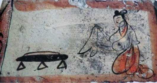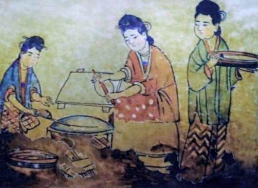 在甘肃嘉峪关发现一批魏晋时代墓葬,出土大量彩绘砖画,很多画面都表现了当时的厨事活动,其中就有两幅摊煎饼的图像,其中一位厨娘双手举起煎饼,好像觉得煎得不错呢。