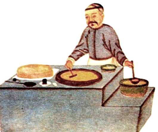 两晋时代有煎饼,而且还被赋予特定意义。隋人《述征记》说:“北人以人日食煎饼于庭中,俗云薰天。”这话本出自南梁宗懔《荆楚岁时记》的记述:“北人此日食煎饼,于庭中作之,云薰天,未知所出。”此日指正月七日人日这一天。前面说过,后来也有用煎饼薰天薰虫的说法,风俗流传了千年。