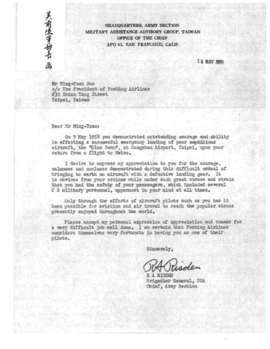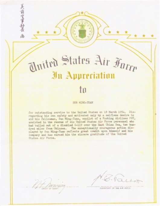 期间最着名的一次任务,就是陈文宽和孙明远驾驶老旧的美制PBY“蓝天鹅”水上飞机救出七名美军顾问的事情,堪称当时飞机海上搜救的经典案例。1955年3月18日上午,一架美军C119飞机在从美军关岛基地飞往台北松山基地的航程中,飞机引擎发生故障,机上七名美军被迫跳伞落于【太平洋(601099)、股吧】中。事发后,美军派出两架HU16“信天翁”水上飞机前往搜救,在发现遇难者后,但由于海面风浪过大无法降落,随即向***民党当局求助。台湾当局派出经验丰富的陈文宽、孙明远机组驾驶老旧的PBY“蓝天鹅”水上飞机前往施救,在浪高风急的海面,于当日傍晚以高超的技术和无畏精神,救出落水幸存的六名美军。为此,美***方为孙明远颁发了嘉奖令称:“对孙明远先生非凡的勇气予以表扬”。