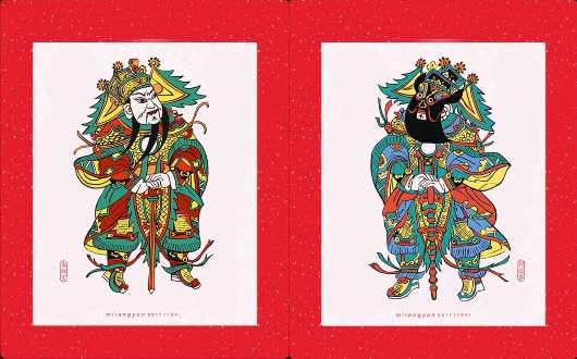 到后来由于历世太多,出现的人物典故也越来越多,加之人民的信仰和需求不同,逐渐衍生出了不少门神,例如驱邪类的神荼郁垒、哼哈二将、文门神天官仙童送子娘娘等,祈福门神福禄寿三公,以及招财进宝等,甚至连岳飞、关羽、包拯也都有份,其中最为火热的当属武门神尉迟恭和秦琼秦叔宝。