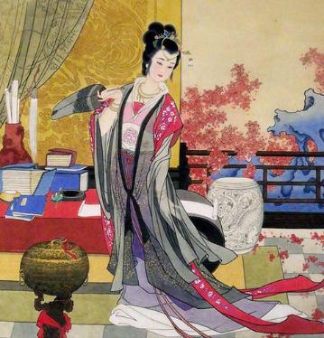 骊山上的华清宫高高地筑在云端,自从杨贵妃得宠以后,人们便可以经常听到轻柔婉转的乐曲声不停地从天际飘来。每日里,杨贵妃穿着色彩艳丽、犹如 彩霞霓虹似的舞衣,头上身上戴满了璎珞珠玉,为唐玄宗跳着她亲自按《霓裳羽衣曲》编制的《霓裳羽衣舞》。只见她挥动起绫罗的衣袖,如同艳丽的荷花在秋日的轻烟中微微摇动,又象嫩绿的柳丝拂着平静的池水。玄宗看得如醉如痴,早已把国家大事丢于脑后了。