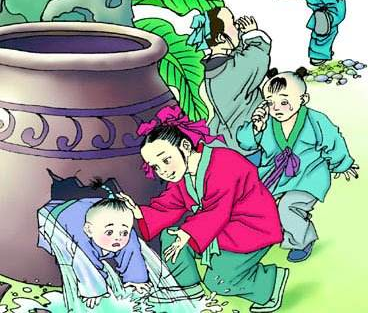 司马光跑到了缸前,因为水缸比他高出一头,看不见缸里的情况,只听到咕嘟、咕哪的喝水声。他想爬又爬不上去,急得团团转。他四下张望,忽然看见不远的地方有一块石头,便急中生智,三步并作两步跑过去,搬来石头,用尽力气向缸砸去。只听见“哐啷”一声,缸破了一个大窟隆,水从缺口急涌而出。溺水的调皮孩从缸口中被冲出来了,浑身水淋淋的,脸色蜡黄,双目紧闭,肚子鼓得很大,司马光看了很害怕。他连喊几声也不见回答,就吓哭了。
