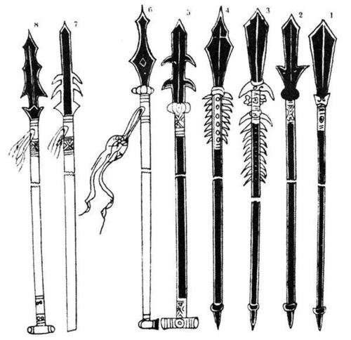 铁枪是硬木做的,长1.4,长1.3,厚3寸7分。枪头呈扁平棱柱形,长7英寸,枪头下有红色流苏。竿头铁三英寸长。