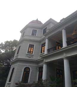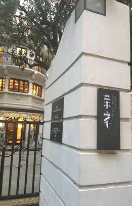 荣氏老宅,一座外观设计精美的百年老建筑,坐落于陕西北路186号。钢筋混凝土结构,主楼于1918年建成,原房主德国人第一次世界大战战败回国,由荣宗敬买下。荣宗敬和他的弟弟荣德生是民国时期的“棉纱大王”和“面粉大王”。荣宗敬是荣毅仁的大伯。1920年扩建时增设了辅楼,辅楼呈六角形,浅红色圆形穹顶。主楼立面两层列柱敞廊,从廊柱顶部辨别,柱子涵盖了古希腊的三种柱式,即多利克风格(廊柱顶端为平板)、爱奥尼风格(简朴的书卷行装饰)和科林斯风格(柱顶为叶形状装饰雍容华贵)。走入一扇扇造型不一的门洞,似乎走进了另一个年代:木质雕花的楼梯扶手,略微蒙尘的彩色玻璃,图案复杂的拼花地板……还有红色的机平瓦,外挑的老虎窗,无一处不带有岁月沉淀下的优雅。窗户外面是葱茏的梧桐,梧桐外面是喧嚣的街道,仅仅隔开一堵墙,却享受了另一种心境。感受着这份都市中难得的静谧。