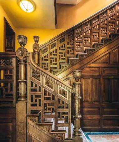 建筑是凝固的音乐。修缮后的荣氏老宅处处体现着设计者的独具匠心:会议室深色木质壁炉刻有极富古典主义元素但又兼具中国风的雕花;饭厅天花板上的装饰型图案取自古希腊和古罗马建筑;维多利亚风格的日光室拥有带有具象场景的面板;荣宗敬夫人房间的护墙板上抽象化的缠绕枝藤和树叶来自阿拉伯花卉……修缮后的老宅内部装饰无处不雕花,地面、木作、珐琅砖、彩粉墙面极为考究,彩色玻璃装饰精美。木质的中式装饰尽显庄重气氛,西式装饰风格又洋气敞亮,中西合璧如交响乐般完美和谐。走进荣宅,令人充分感受到上海百年老建筑的华美风采,充分领略建筑艺术之美,也不由令人回忆起这座建筑的主人——荣宗敬的人生故事。