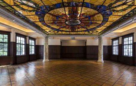 气派非凡的宴会厅,荣宅主人曾在此招待过当时有名的军阀头目孙传芳,宴会厅的彩色玻璃天顶尤为闪耀。