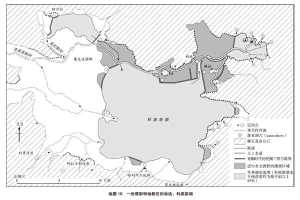 至迟自迈锡尼时代起,希腊山区盆地的居民们便在改造当地环境方面展现出了伟大才能(Lauffer 1986)。地图16 反映了在彼奥提亚中部大片封闭盆地处建设的水利工程,以及当地居民堵截山脊侧面谷地洪水的工程、对永久性泉水进行引流的管道和在沼泽与湖泊中修建的、分隔湿地资源与来自进行排水和灌溉的谷地的供水的堤坝。它们还反映了这些工程适应各地地形特征的细致之处。科派斯湖(Lake Copais)周边的中心湿地为居住在广阔范围内的大量人口提供了资源,在古典时期以其农业和水利工程的发达闻名于世。意大利中亚平宁山脉福奇尼湖(the Fucine lake)所在的山间盆地似乎也存在着类似的现象。