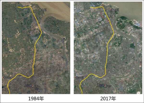 从图上可以看出1984年时上海市中心和宝山之间还是一派田园风景,到2017年则全部变为城市风貌。图中黄色线为地铁3号线。底图来源:Google Earth