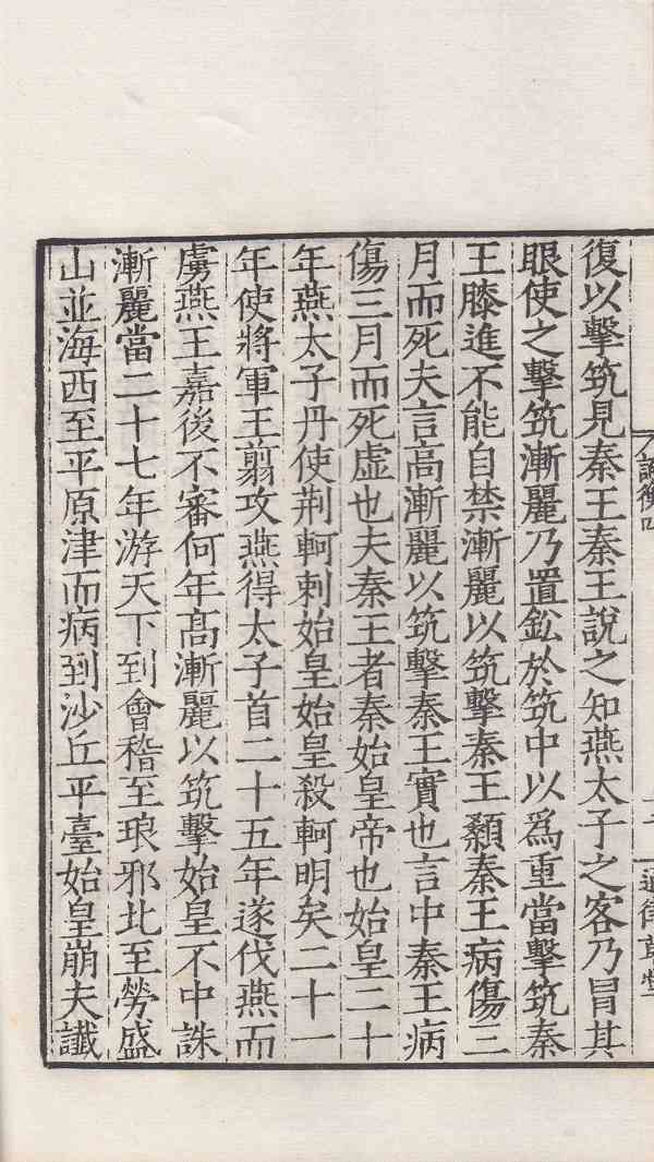 传书又言:燕太子丹,使刺客荆轲刺秦王不得,诛死。后髙渐丽复以击筑见秦王,秦王说之。知燕太子之客,乃冐其眼,使之击筑。渐丽乃置铅于筑中以为重。当击筑,秦王膝进不能自禁,渐丽以筑击秦王颡,秦王病伤三月而死。