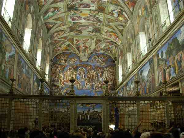 后来经由米开朗基罗绘制屋顶壁画和祭坛壁画之后的西斯廷礼拜堂内部
