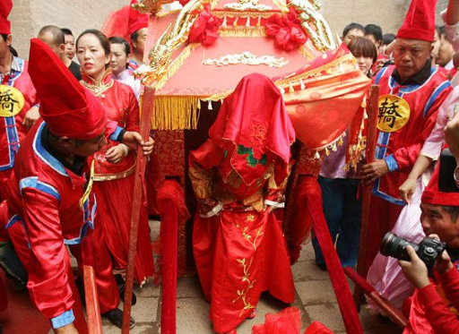 当花轿去女方家时,女方家会放鞭炮,必须给红包才能打开。花轿停在门外,女方家必须带上红烛和镜子,到轿子里看看,赶走藏在轿子里的冤鬼。上轿子之前,新娘要经过喜娘三次催促,要假装不愿意结婚打扮,然后坐在妈妈腿上,意思是她不应该忘记父母的养育。
