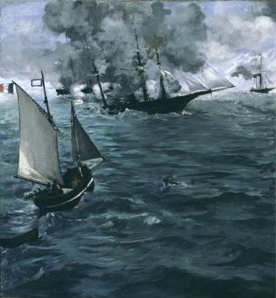 这幅由印象派先驱马奈于1864年绘制的油画,生动地反映了英国为南方制造的“亚拉巴马号”战舰,于法国瑟堡附近海域,为北部联邦军队击败的场面。复杂的地缘政治格局,由此也可窥见一斑