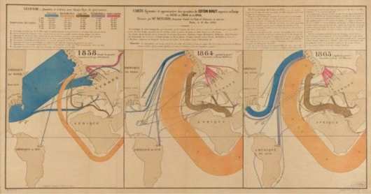 法国着名制图家约瑟夫·米纳德绘制的图表,反映了南北战争对全球棉花贸易的影响