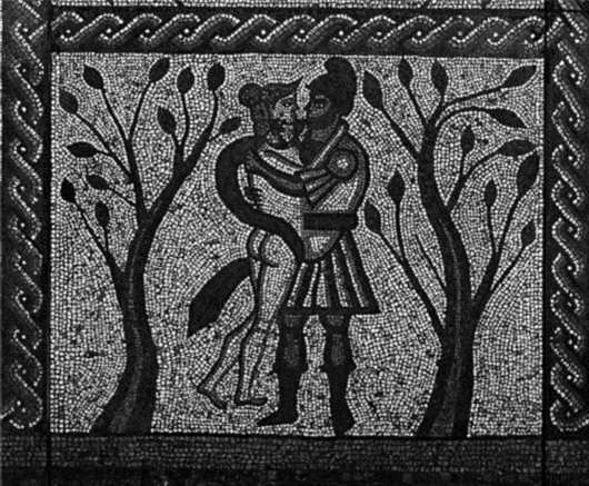 这幅来自英格兰南部下哈姆(Low Ham)罗马别墅中浴室地面上的 4 世纪镶嵌画描绘了维吉尔《埃涅阿斯纪》中的一系列场景:埃涅阿斯抵达迦太基,狄多与埃涅阿斯外出打猎,画面尽可能简洁地刻画了迦太基女王与特洛伊英雄的激情