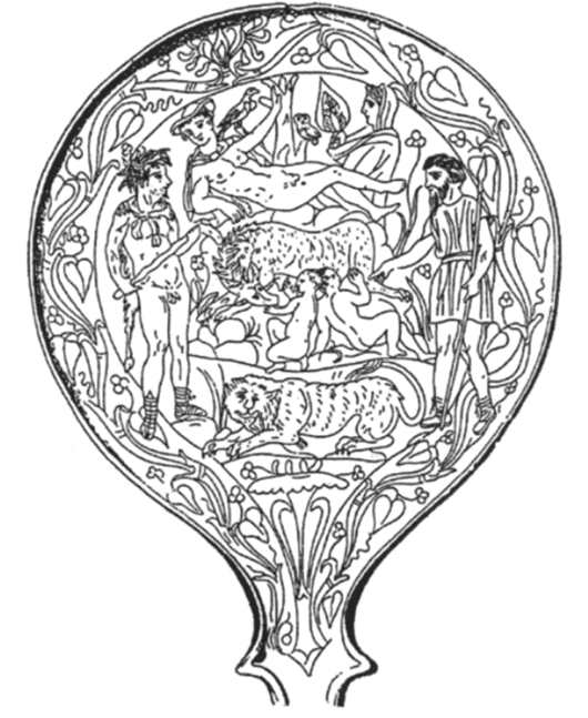 在埃特鲁里亚人的土地上发现的这面雕花镜(镜面位于另一侧)似乎描绘了罗慕路斯和雷慕斯被母狼哺乳的某个版本。如果是这样,那么这面被认定为公元前 4 世纪的镜子将是该故事的最早证据之一。但一些可能过于多疑的现代学者倾向于认为,这里描绘的是埃特鲁里亚神话中的场景,或者是一对远为神秘和鲜为人知的罗马神明:“守护者”拉尔兄弟(Lares Praestites)