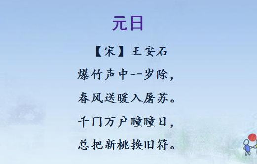 《元日》是著名作家王安石的诗,这首诗描写的是春节除旧迎新的情景。它以民俗为基础,吸收老百姓,春节的典型材料,把握生活中具有代表性的细节:燃放鞭炮、喝屠苏酒、换上新的桃符,充分展示了元旦的欢乐气氛,充满浓郁的生活气息。