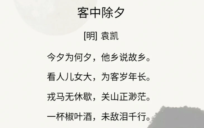 《客中除夕》是明朝作家袁凯写的,这首诗讲的是除夕夜的思乡和乡愁。诗以一句“今夕是何夕”与“除夕”有关,“故乡”与“客家人”有关,语言含蓄,暗示客家人的悲哀;第二联出自前一联,写的是客生之寒,思乡之久。在这种联合叙事中,有悲愤,有才华的匮乏,有野心的付出的艰难,有留他乡,停滞的悲哀,有思乡的无奈,其中也隐含着作者的乡愁和回乡的迫切心情;第三章指出了作者淹没留他乡并在年底未归的原因。全诗语言质朴无华,诗中没有新的奇特的意象,却是一部以质取胜而不是以名取胜的思乡之作。