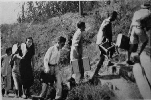 林语堂(右起第三位)一行在重庆躲避日机空袭,1941年。左起第三位是林语堂长女林如斯。台北林语堂故居藏。