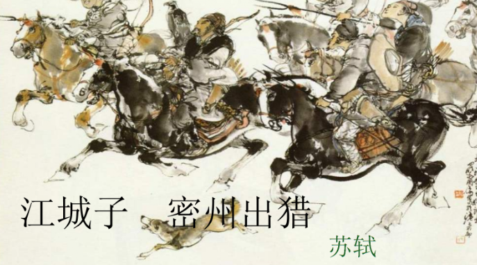 熙宁八年(公元1075年)十月,苏轼率领很多人马,到常山祭神祈雨。回来的路上,他和同僚们在铁沟附近举行一次习射打猎。苏轼这年三十九岁,也牵猎狗,驾雄鹰,弯弓射箭,参加打猎活动。这个活动激发了苏轼的豪情壮志,他用粗放的笔调,写下了气壮山河、光耀千古的爱国主义词篇《江城子.密州出猎》。原词是这样的: