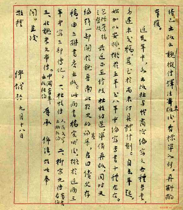 为了提高我写作时的文字表达力,先生还针对我的弱点,几乎手把手地教我如何写好文章。先生少习古文,曾受教于清末桐城派古文大师吴汝纶的再传弟子,作文讲究义法和文字的清疏雅洁,所以骈文散文均章法谨饬、隽丽可观。在文史学界,先生所撰文章着作的文笔之美,是有口皆碑的。先生认为,好的文章,首先应是文气相属,句断意连,宕折有致,结构则简练精要,不枝不蔓,无芜辞累句。为了纠正我作文时文气扞格不通,逻辑不强,文字时见冗杂枝蔓之病,先生费尽了苦心。