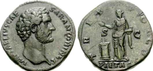 罗马皇帝安东尼“庇护”的硬币,他十分受元老院与人民的喜爱,罗马人把“责任”二字放到了他的名字中。Antoninus “Pius”,就像“Pius” Aeneas一样