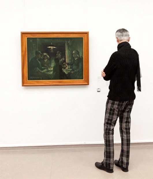 游客正在欣赏《吃土豆的人》 东方IC 资料图受损最为严重的一幅,是梵高早期的名作《吃土豆的人》。它完成于画家移居法国之前,色调晦暗,笔法粗粝凝重,暗淡的灯光下呈现出一个矿工家庭的简陋晚餐。画面的部分后来得到了妥善修复,挂回到原有的展位。然而就在博物馆的礼品部,你可以看到这件对于贫弱者充满同情的作品,被用在一种薯片的包装设计中,显得很不严肃。