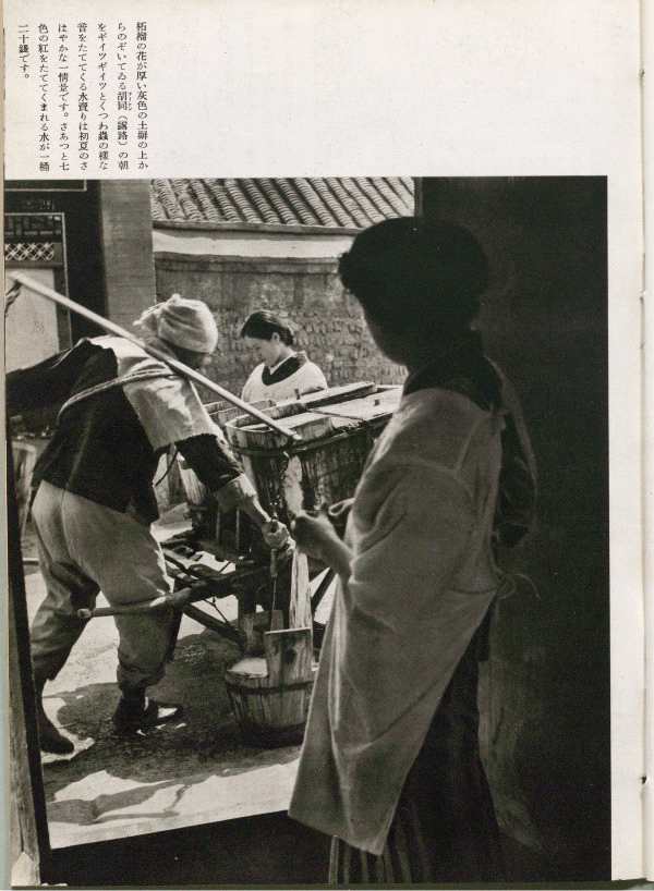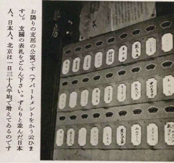 本来是中国人的公寓,随着日本人的涌入,这所公寓也出现了日本人的门牌,所配文字显示日本人以每天三十人的速度涌入北京,与前文官方统计稍有差别。饮水是大问题。本来那时北京下水道的水质还是不错的,不过井水里的石灰粉很多,还会掺杂有肥皂水,所以井水可以洗澡,但无法饮用。日本人通常买水喝。胡同里卖的水是二十钱一桶。