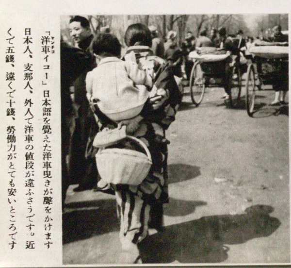 拉洋车的车夫学会日语“洋车”的发音,看到日本主妇出门,就招呼她们。中国人和日本人使用洋车的价钱不一样,对日本人来说,近处五钱,远处十钱。