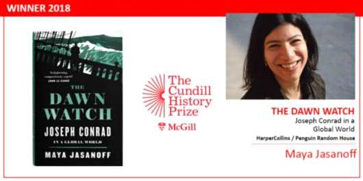 第11届“麦吉尔大学坎迪尔历史奖(The Cundill History Prize of McGill)”(以下简称“坎迪尔奖”)评选结果于当地时间11月15日晚(北京时间11月16日上午)在加拿大东部城市蒙特利尔揭晓。马娅·亚桑诺夫(Maya Jasanoff)的《守候黎明:全球化世界中的约瑟夫·康拉德》(The Dawn Watch: Joseph Conrad in a Global World,2017,中译本2018年11月由社会科学文献出版社/索·恩推出,译者金国)荣获本次评选的大奖(Grand Prize),作者赢得奖金75000美元(约合人民币52万元)。同时入围决赛的另两部作品——萨姆·怀特(Sam White)的《寒冷相迎:小冰期以及欧洲与北美的碰撞》(A Cold Welcome: The Little Ice Age and Europe’s Encounter with North America, 2017)和卡罗琳·弗雷泽(Caroline Fraser)的《草原之火:劳拉·英格斯·怀德的美国梦》(Prairie Fires: The American Dreams of Laura Ingalls Wilder, 2017)获得优秀奖(Recognition of Excellence Prizes),每位作者获奖金10000美元(约合人民币7万元)。