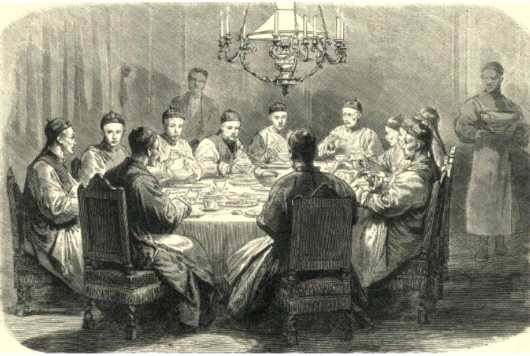 清朝驻巴黎使团在使团官邸饭厅举行的晚宴。戈弗雷 杜兰德绘图。选自《世界画报》(Le Monde illustré),1869年1月16日,发行第13年,第614期。