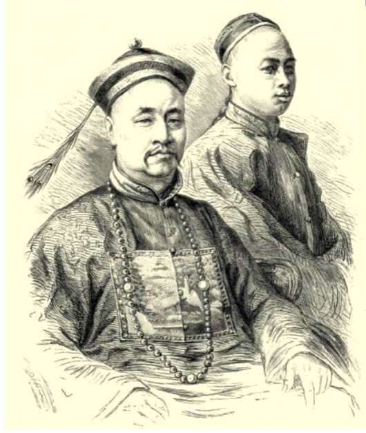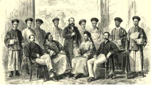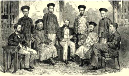 驻巴黎的清朝使团。使团成员分别为:俄语翻译桂荣,法语翻译联芳,英语翻译舍米尔,英语翻译凤仪,一等秘书德善,三等公使孙家谷,全权公使蒲安臣,二等公使志刚,一等秘书柏卓安。雅内·朗日根据《画刊》绘制。选自《全球画报》(Le Journal illustré),1869年2月28日,星期日,第9期。