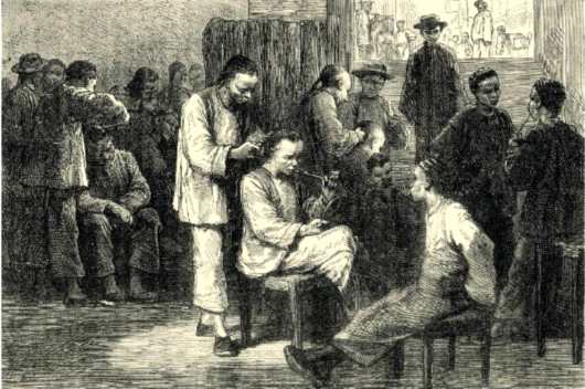 旧金山的清朝理发师。顾客们站着排队等号。选自《旅行画报》(Journal des Voyages),1880年1月11日,星期日,第131期。