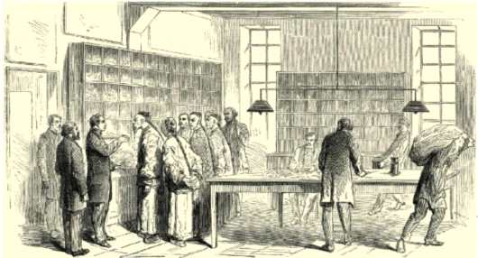 清朝使团参观巴黎邮政局的境外业务部。克洛泽先生绘图。选自《世界画报》(Le Monde illustré),1866年5月26日,发行第10年,第476期。